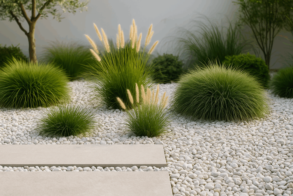 Persistants taillés, graminées, vivaces sobres et quelques arbres sculpturaux comme points focaux.